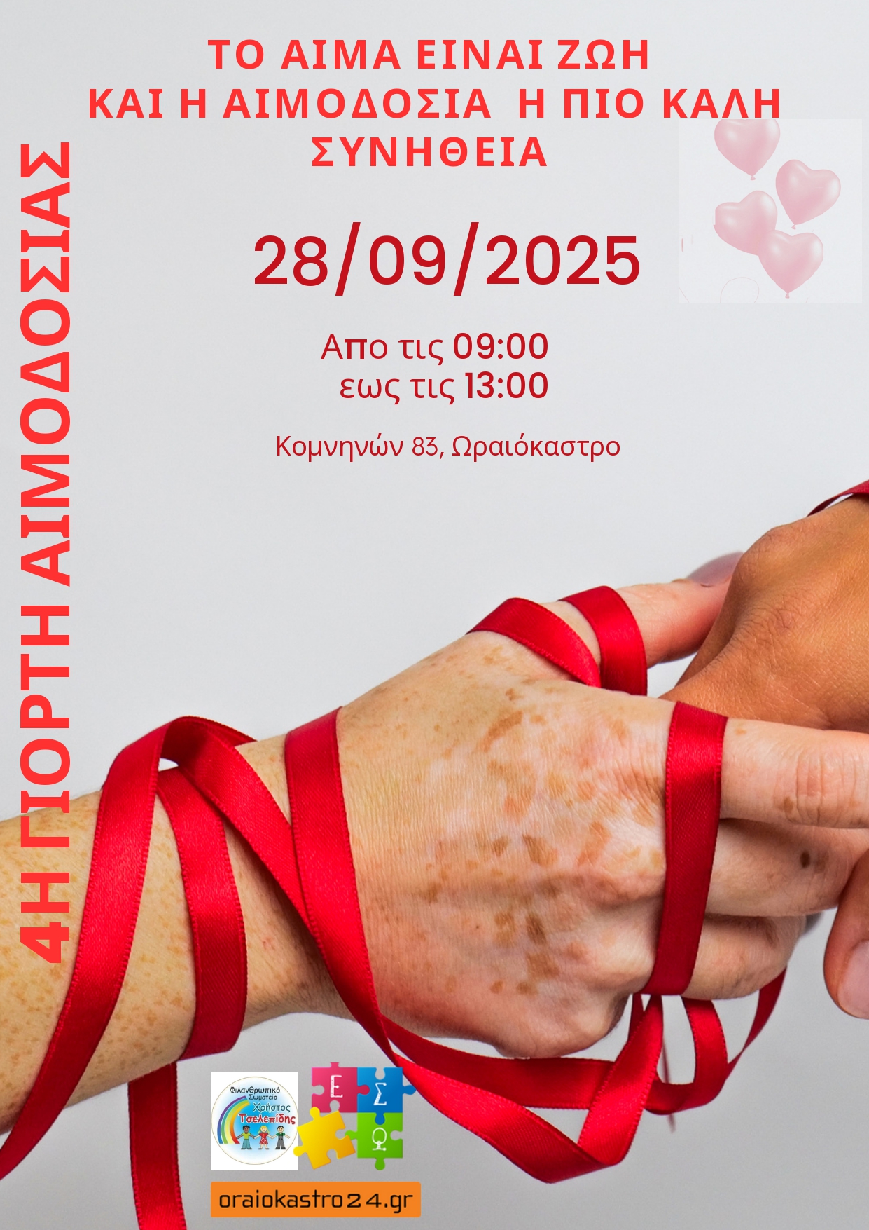 Με μεγάλη μας χαρά θα θέλαμε να σας προσκαλέσουμε στην «4η Γιορτή Αιμοδοσίας» που θα πραγματοποιήσει το Φιλανθρωπικό Σωματείο “Χρήστος Τσελεπίδης” σε συνεργασία με τον Εμπορικό Σύλλογο Ωραιοκάστρου και το oraiokastro24.gr, την Κυριακή 28 Σεπτεμβρίου 2025.